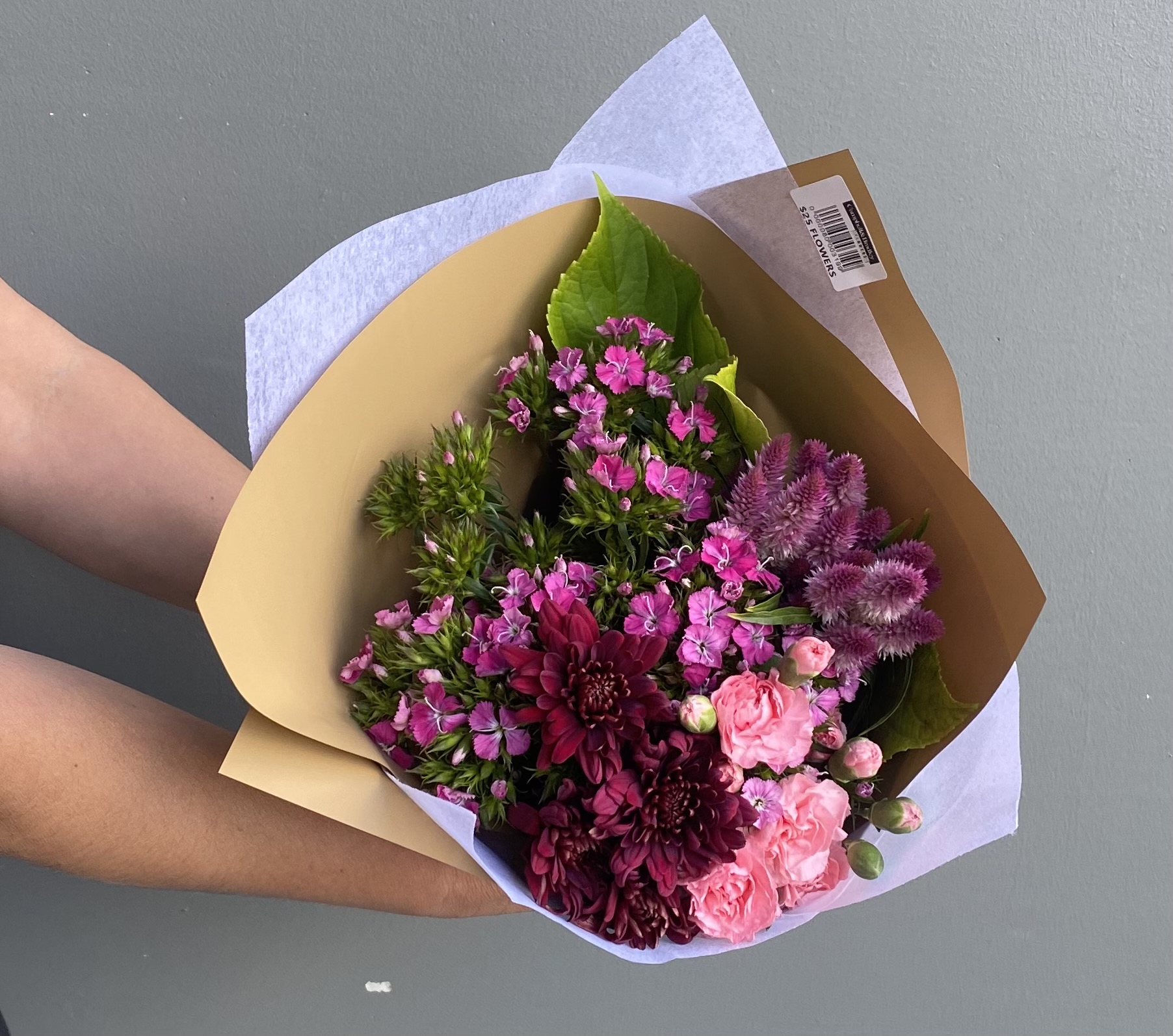 All of our market mix small bouquets are carefully put together using seasonal ranges and vary throughout the year. These include chrysanthemums, roses, lilies, proteas and asters. Image is to provide an indication of size rather than actual product. Colour ranges will vary with seasonality of flowers.
