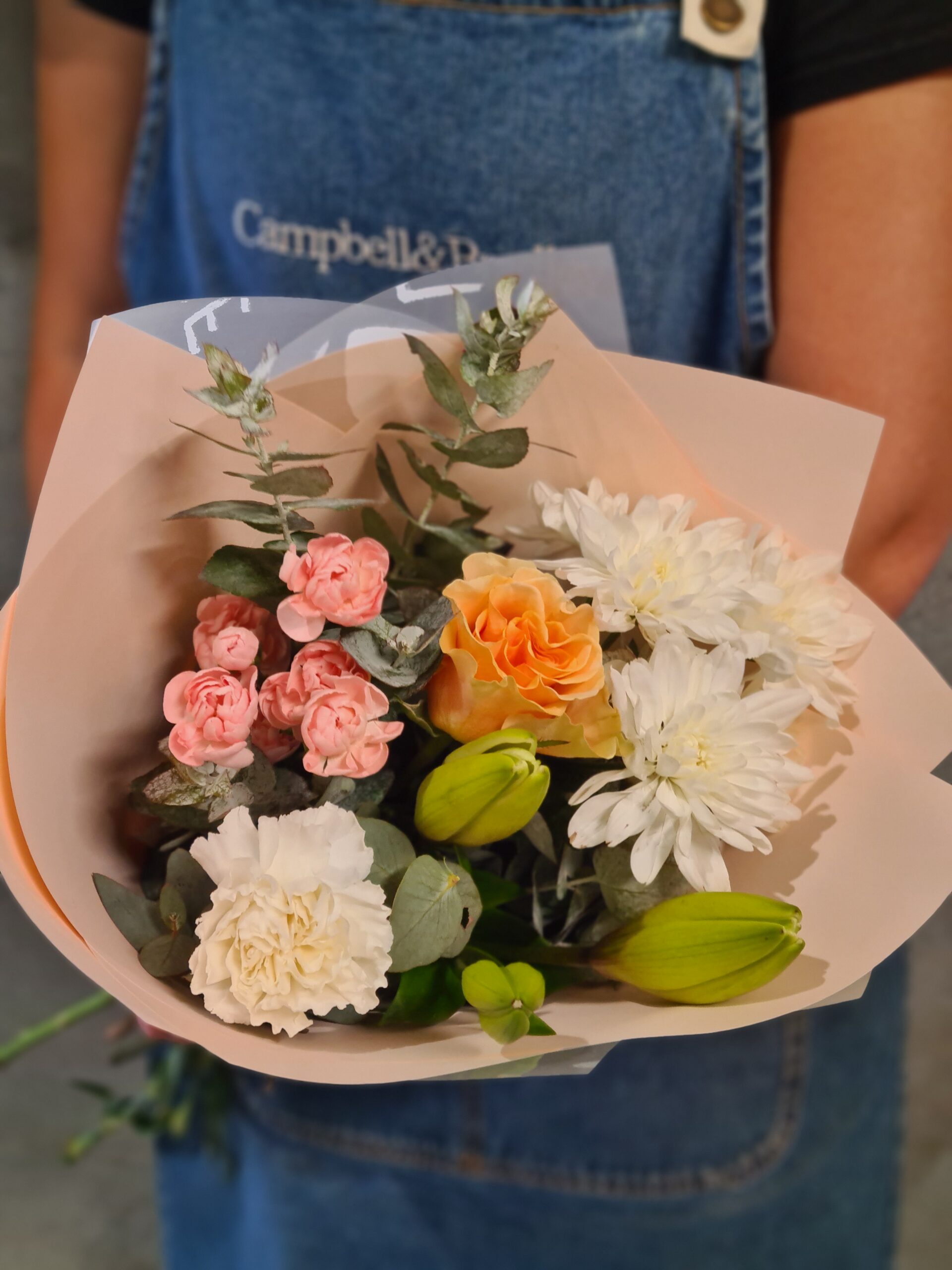 Native Australian flowers vibrant and hardy. The perfect choice for a long-lasting posy. It’s brought together with beautiful flowers and foliage including banksias, protea, grevillea, leucadendron and eucalyptus gums.